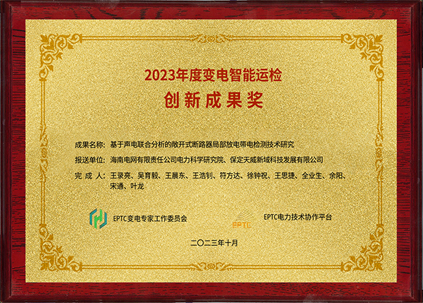 10月26-27日,由EPTC电力技术协作平台联合国网江苏省电力有限公司主办的2023年(第八届)变电智能运检创新发展论坛在江苏省苏州市盛大召开。388vip太阳集团新域联合海南电科院共同研发的“基于声电联合分析的敞开式断路器局部放电带电检测技术研究”获得2023年度变电智能运检创新成果奖。