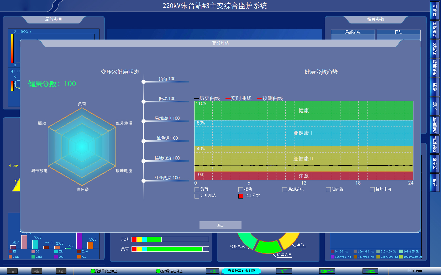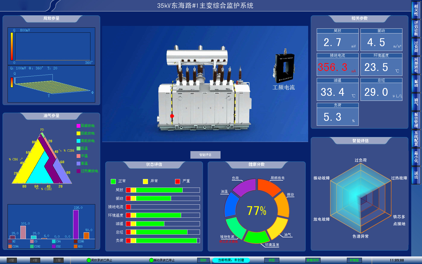 多参量实时综合监测和分析。整套系统能够监测变压器的局部放电、油中气体、温度、振动、接地电流等多参量实时数据,并进行综合分析。
